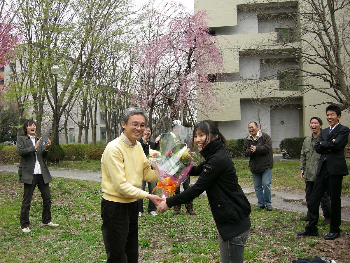 学部4年生と修士2年生が卒業を迎えました.記念撮影しました.写真2は,4年生を代表して木村氏から桑原先生への花束贈呈です.クリック拡大すると雰囲気が味わえますよ.